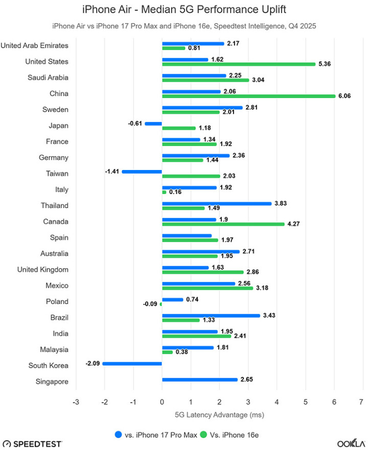 苹果首款自研基带C1率先搭载在iPhone 16e上,而第二代升级款C1X则用在了iPhone Air 机型上。把柄苹果官方的说法,C1X的速率是C1的2倍,关联词依旧不相沿毫米波5G。那么其信号和传输速率发达究竟若何,知名测速机构Ookla就对其进行了测试。