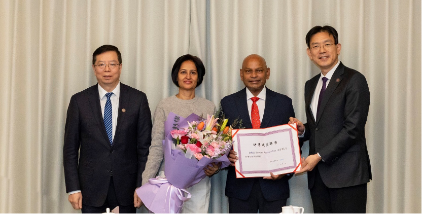 清华大学党委通知邱勇(左一)、校长李路明(右一)与西拉姆爱妻合影