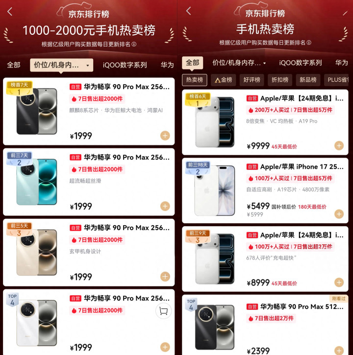 畅享90系列自从发布后开动,如故成为了同价位智能机市集的销冠,致使部分型号出现了断货的情况。据蚁集榜单来看,在1000至2000元的销售市聚集,畅享90 pro max的四种配色内存霸榜前四名。在全品牌热卖榜当中,前三名是iPhone机型,畅享90 pro max也在该榜单当中拿下等四名的获利,这足以诠释畅享90系列发布之后成为了当下大热的电子居品。