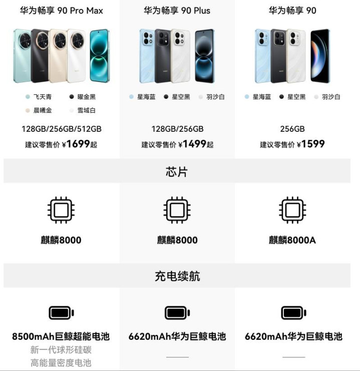 这次畅享90系列机型的树立价钱,就属pro max版块最受接待。该机型起步是128G内存,最高可遴荐512G内存。搭载麒麟8000芯片,同期还有一块8500毫安的高密度硅碳电板,售价1699元起步,访佛国补之后的价钱是1445元起步。