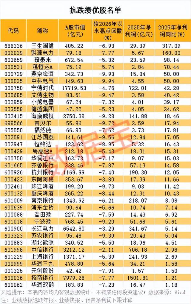 证券时报·数据宝左证以下条目,筛选出抗跌的绩优股:1.收尾3月23日收盘,最新收盘价较年内高点回撤不及10%;2.收尾3月23日收盘,鼎新市盈率低于30倍;3.按照2025年年报、功绩快报、预报净利润下限(若无下限则取公告数值)谋划,2025年净利润为偶合且同比增长(含扭亏为盈)。