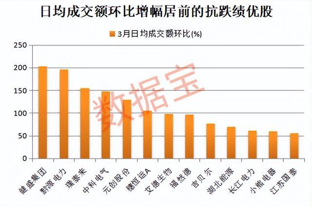 从二级市集进展来看,上述35只抗跌绩优股中,3月以往常均成交额环比上个月增长10%以上的有23只,6股日均成交额环比增幅翻倍,离别为健盛集团、黔源电力、璞泰来、中科电气、元创股份、穗恒运A。