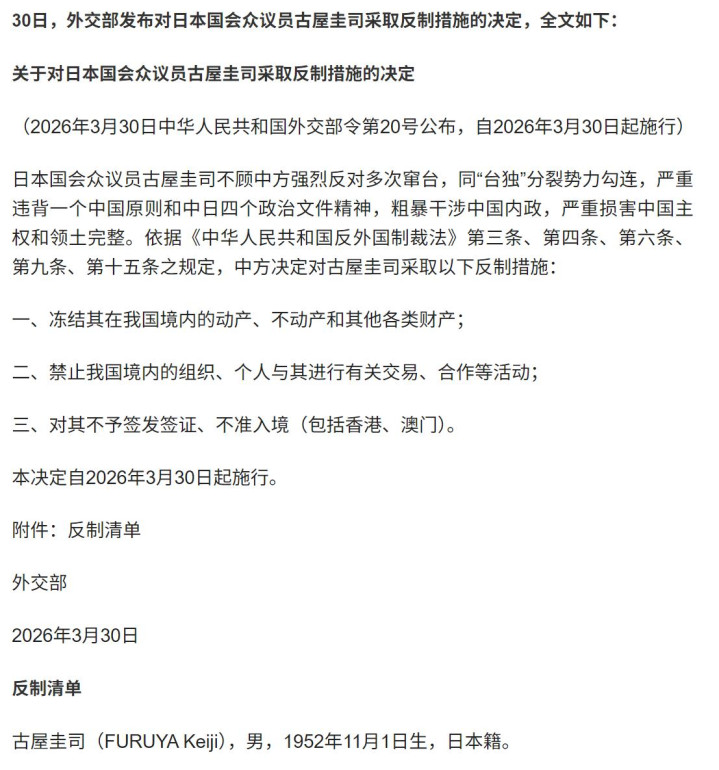 3月30日,酬酢部认真动身点,依据《中华东说念主民共和国反番邦制裁法》,对日本国会众议员、高市早苗中枢相知古屋圭司,实践严厉的反制设施。