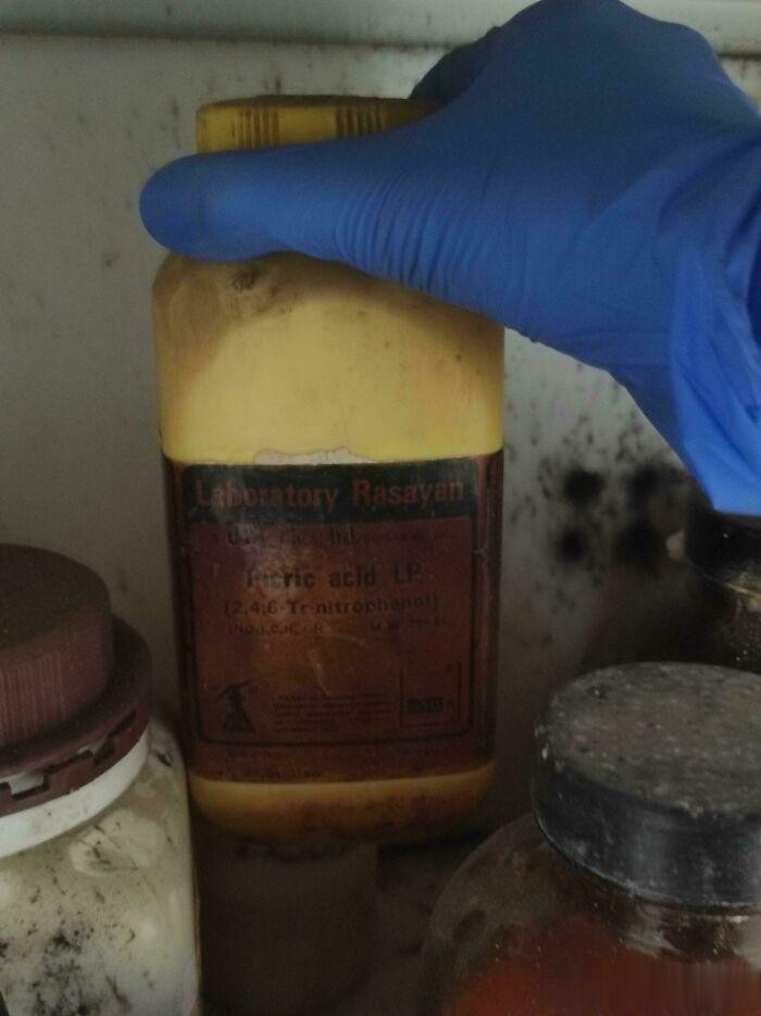 38.一瓶腐烂的苦味酸,这种酸干燥后易爆,十分危急。