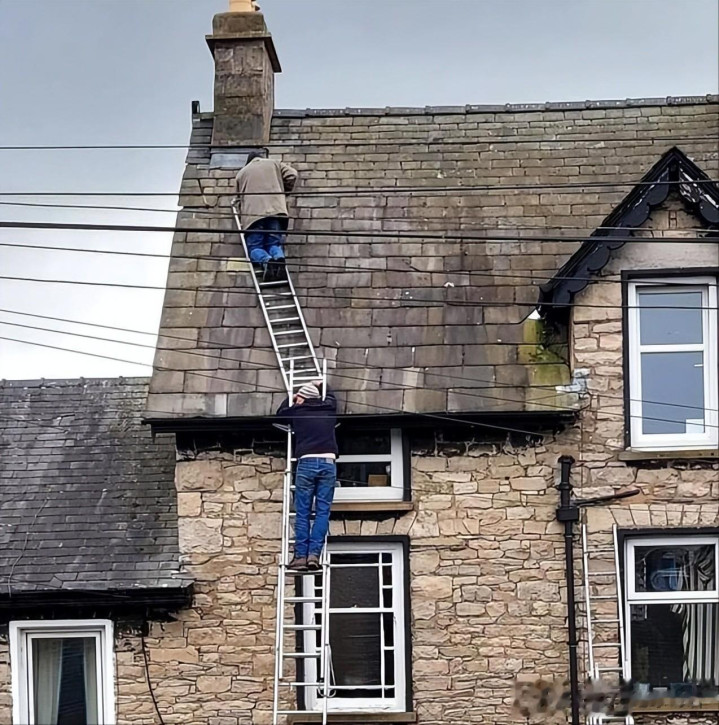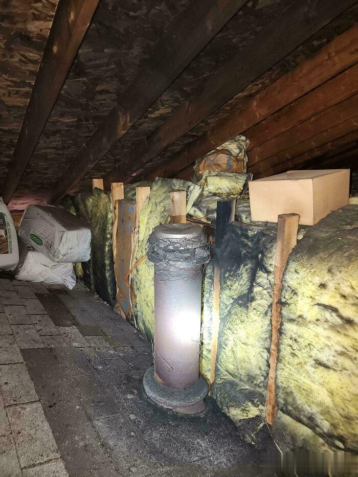 48.这栋屋子约2006年扩建时,承包商把屋顶盖在燃油炉烟囱上方,导致排烟受阻,阁楼积满烟灰,十分危急。自后整根烟囱被更换,并按步调从屋顶外正确排烟。
