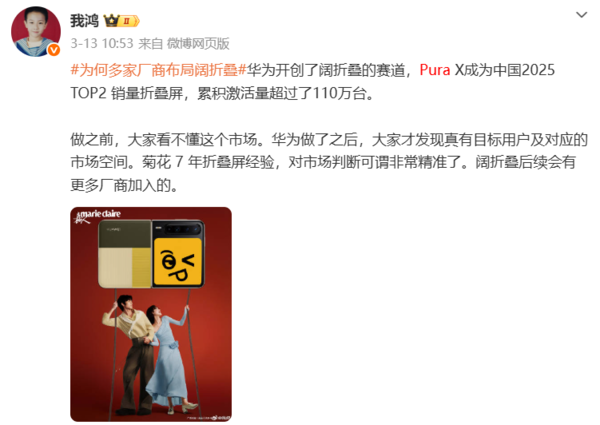 据博主“我鸿”此前清晰,B体育官方网站首页华为PuraX已成为中国2025年销量名次前二的折叠屏机型,累计激活量跨越110万台。海外数据公司IDC的统计炫耀,2025年中国折叠屏手机阛阓出货量约1001万台,同比增长9.2%,其中华为凭借最为全面的产物布局,阛阓份额跨越70%位居第一。