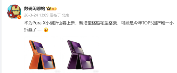 [CNMO科技讯息]3月24日,博主“数码漫谈站”爆料称,华为PuraX“小阔折”行将迎来上新,新增型格橙和型格紫两款新配色。博主同期指出,这可能是本年国产TOP5厂商中独一的小折叠屏手机。这一讯息意味着,华为在折叠屏领域的互异化布局仍在捏续深入,通过拓展色调矩阵进一步安逸其在该细分阛阓的最初地位。
