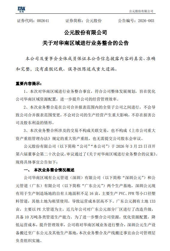 3月23日,公元股份(002641.SZ)公告,公司华南区域有深圳公元和广东公元两个分娩基地,深圳公元现存用于分娩制造场面的自有地盘面积不及16亩,主要分娩PVC、PPR等小口径塑料管说念,滚球(中国)官网app其他地盘为租出使用,导致运营资本居高不下。广东公元领有地盘133亩,B体育(BSports)主要以PE大管说念为主,近几年公司对广东公元部分厂区进行了矫正升级,具备10万吨种种管说念分娩智力。为了进一步整合公司资源,普及管制成果,公司将对华南区域业务进行整合,深圳公元分娩建立搬迁至广东公元过火他分娩基地。这次搬迁有关职责将产生搬迁运脚、调试费、职工安置费等用度开销展望约3000万元~3500万元。
