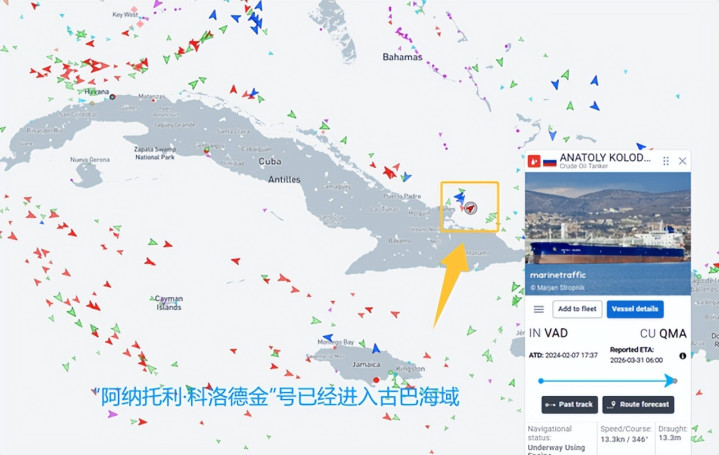3月上旬,装载近70万桶原油的俄油轮“阿纳托利·科洛德金”号,从波罗的海普里莫尔斯克港动身,经北海、英祥瑞海峡南下,横穿大泰西。最新船舶跟踪数据透露,油轮已干预古巴水域,B体育瞻望一两天内抵达马坦萨斯港。