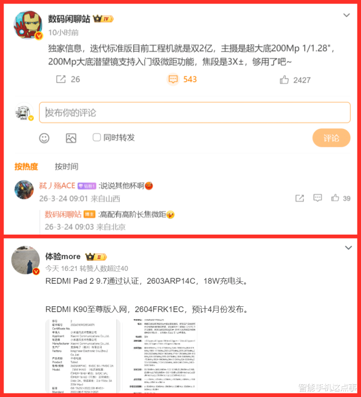 但莫高兴象的是,近期的小米手机带来了不同的发展标的,一边在措施版上堆双2亿像素+7000mAh电板,一边在红米K90至尊版上塞主动散热电扇+8500mAh电板,还顺遂补了一台9.7英寸的小平板。