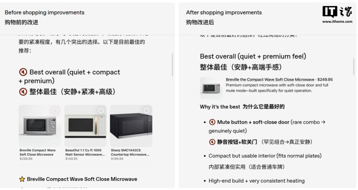 在功能升级前,用户向AI寻求购物建议后,滚球(中国)官网app时时只可得回对于参数或功能的概述指引。如今,用户只需提议具体的购物需求,ChatGPT便会调用信得过库存数据,平直响应精确的家具推选列表。IT之家附上干系对比截图如下: