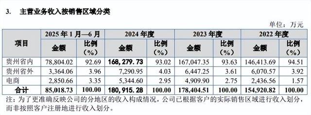 另外,主贸易务收入主要开始于大本营贵州省内,文书期内永诀为14.64亿元、16.7亿元、16.83亿元、7.88亿元,占比从94.51%下滑至92.69%,期末省外、电商渠说念收入永诀为3364.06万元、2850.66万元,占比永诀为3.96%、3.35%。