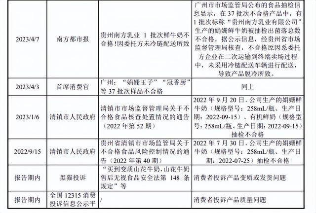 家具存在抽检分歧格情形。文书期内,南边乳业旗下家具存在屡次抽检分歧格的情况,2022年7月,公司坐褥的娟姗鲜牛奶(规格型号:258mL/瓶、坐褥日历:2022-07-25)抽检分歧格;9月,公司坐褥的娟姗鲜牛奶(规格型号:258mL/瓶、坐褥日历:2022-09-15)、有机鲜奶(规格型号:258mL/瓶、坐褥日历:2022-09-15)抽检分歧格,主要原因为交付方在物流运载以及二次运载到末端卖场过程中,未严格按照冷链配送要求进行配送所致。