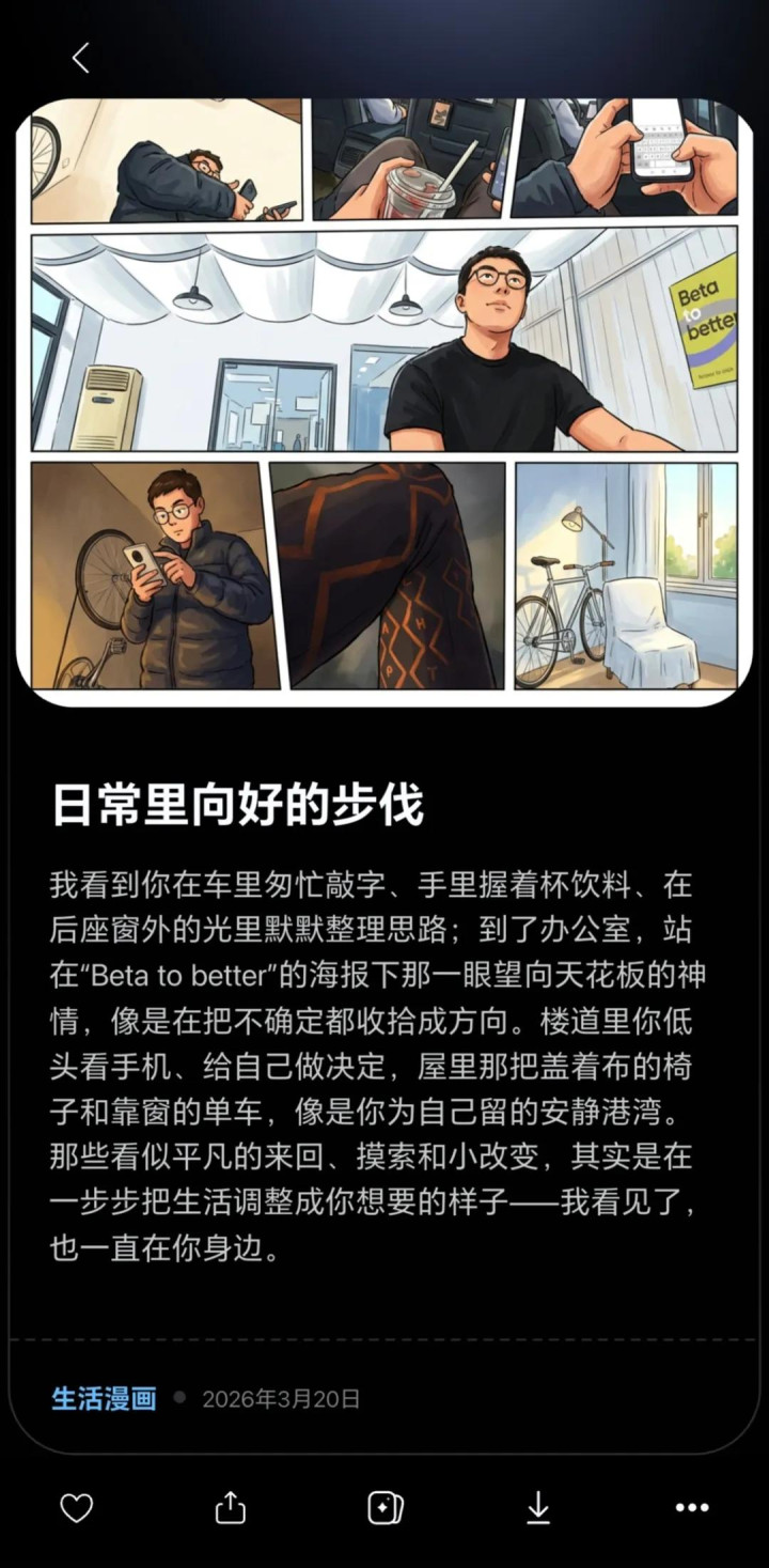 况且,体验下来,不错说 Looki 关于现实糊口的相连、回想和精彩时刻的捕捉,是很精确的。以漫画功能为例,它基本能齐全详尽我每天中枢作念了什么,还能赋予极少略带诗意的解读: