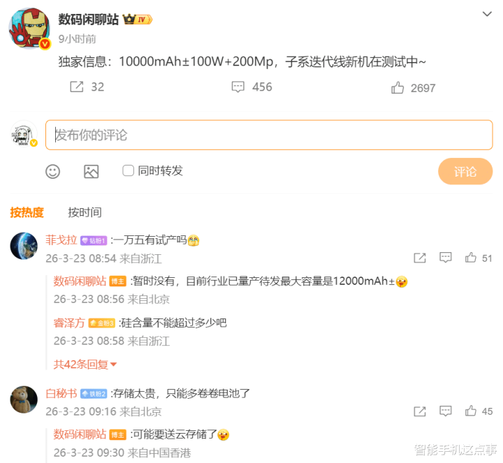 这句话出自一位博主爆料下的评述区,说的是REDMI Note系列新机正在测试10000mAh电板和100W快充,还配了一颗2亿像素传感器。