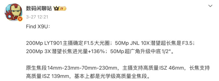 数码博主微博截图 / 爆料Find X9 Ultra相机规格参数